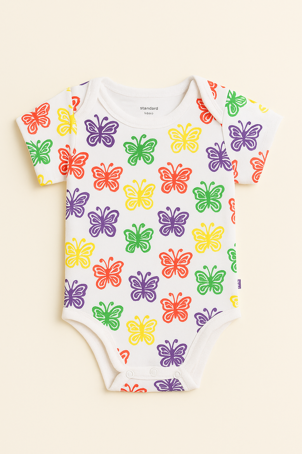 Add a touch of charm to your baby's wardrobe with this adorable butterfly print bodysuit. Featuring a lively multicolored butterfly pattern on a soft white base, this onesie is perfect for everyday wear. The envelope neck design ensures easy dressing, while the snap-button closure at the bottom makes diaper changes hassle-free.