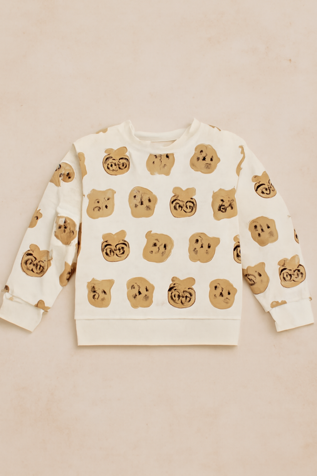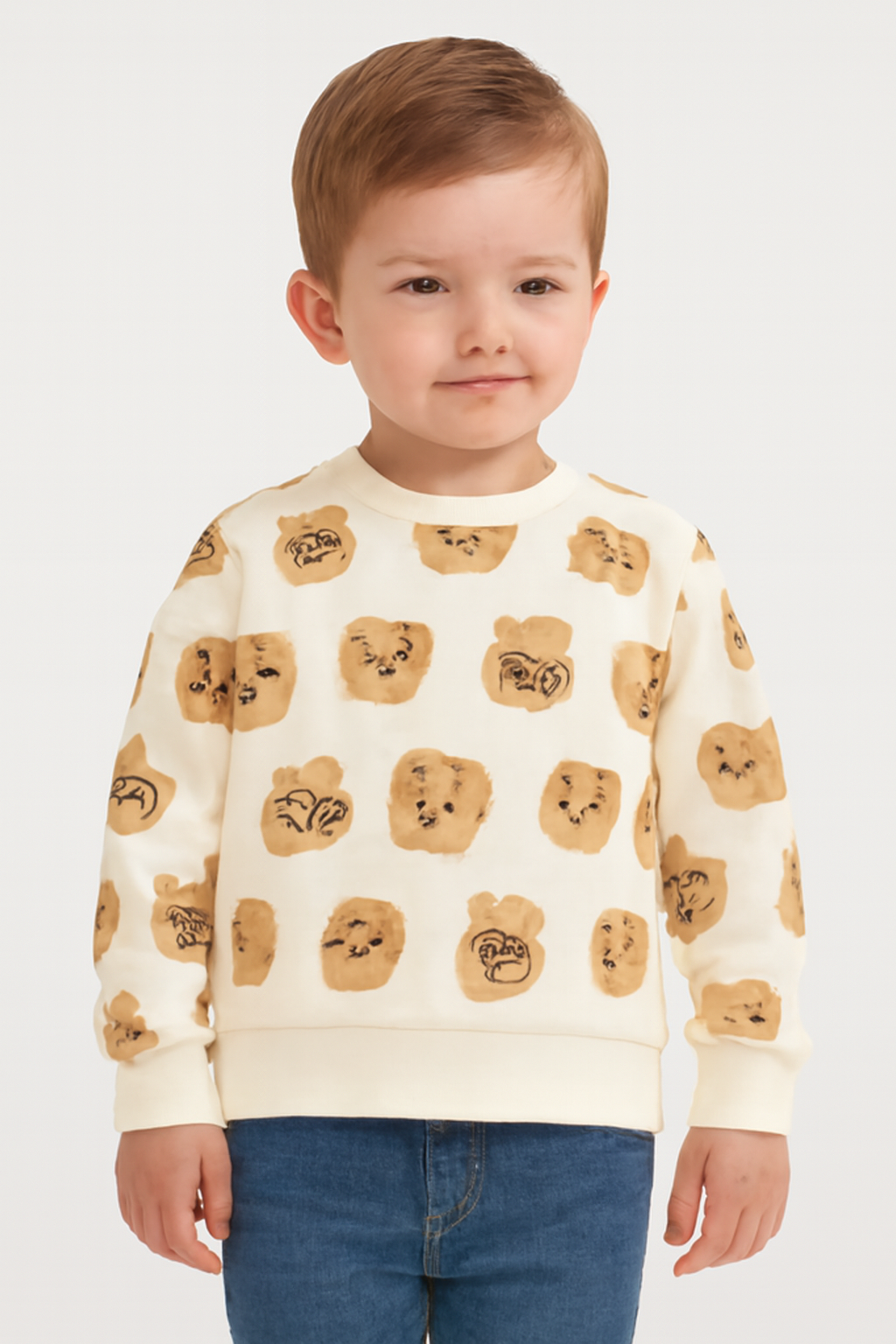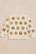 This cute bear print sweatshirt is perfect for your little one! Made from soft and comfortable fabric, it features a charming design with playful bear faces scattered across the fabric. The neutral colors of beige and brown give it a warm, cozy feel, making it an ideal choice for everyday wear. The ribbed cuffs and hem provide a snug fit, and the relaxed cut ensures comfort for active kids.