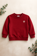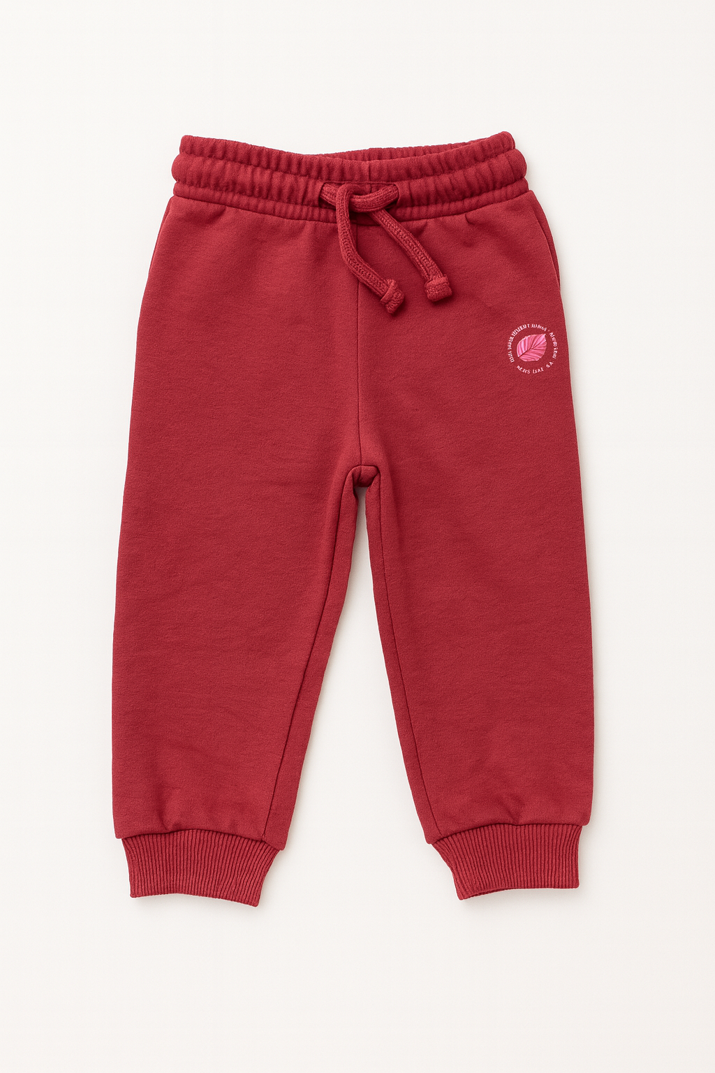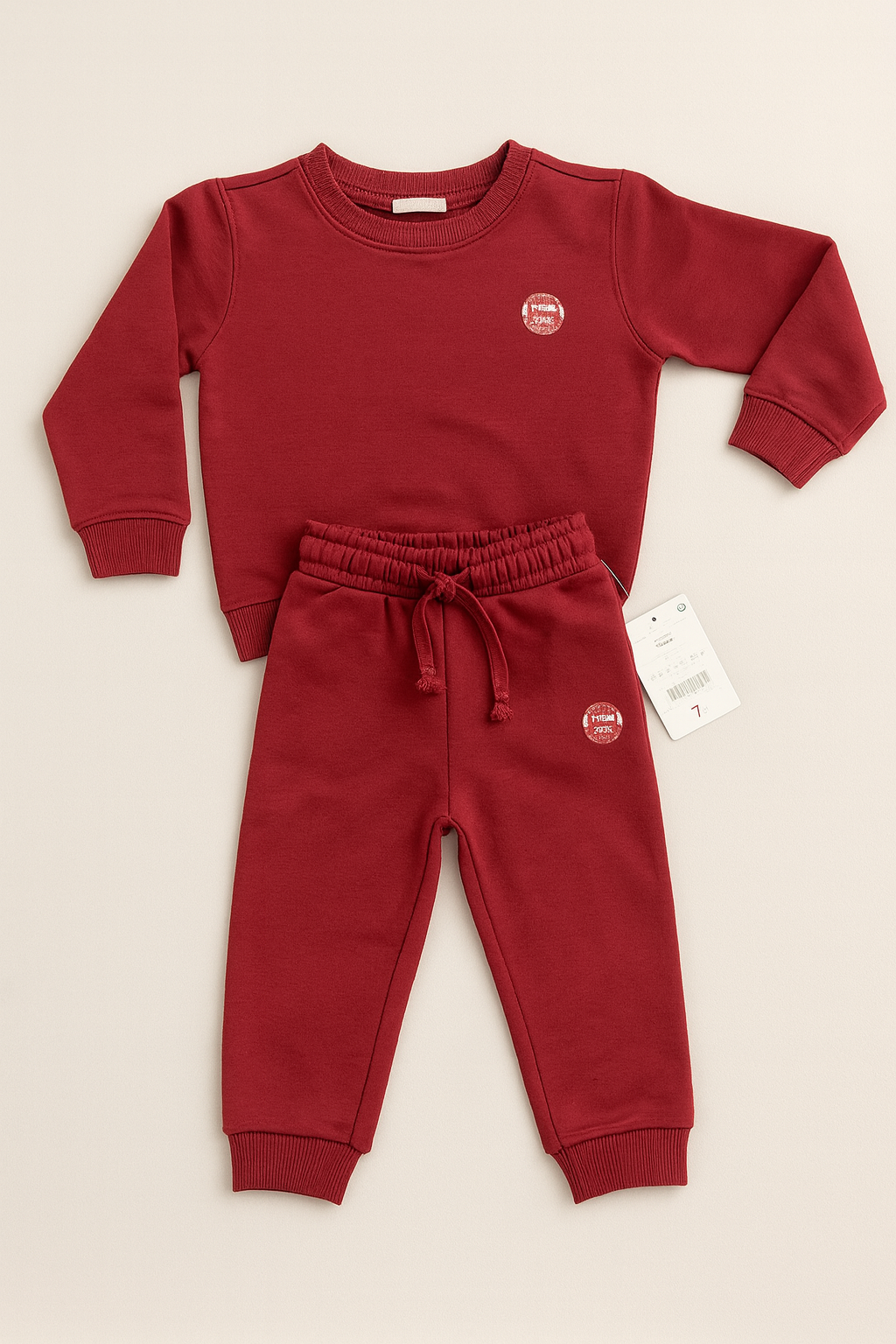 This stylish deep red kids’ tracksuit is designed for comfort, durability, and everyday wear. Made from soft cotton-blend fleece, it includes a smooth crew-neck sweatshirt paired with matching jogger pants. The set features subtle printed badge details on both the top and bottoms, adding a sporty touch. Perfect for playtime, outings, or lounging, this coordinated outfit brings warmth and style together effortlessly.