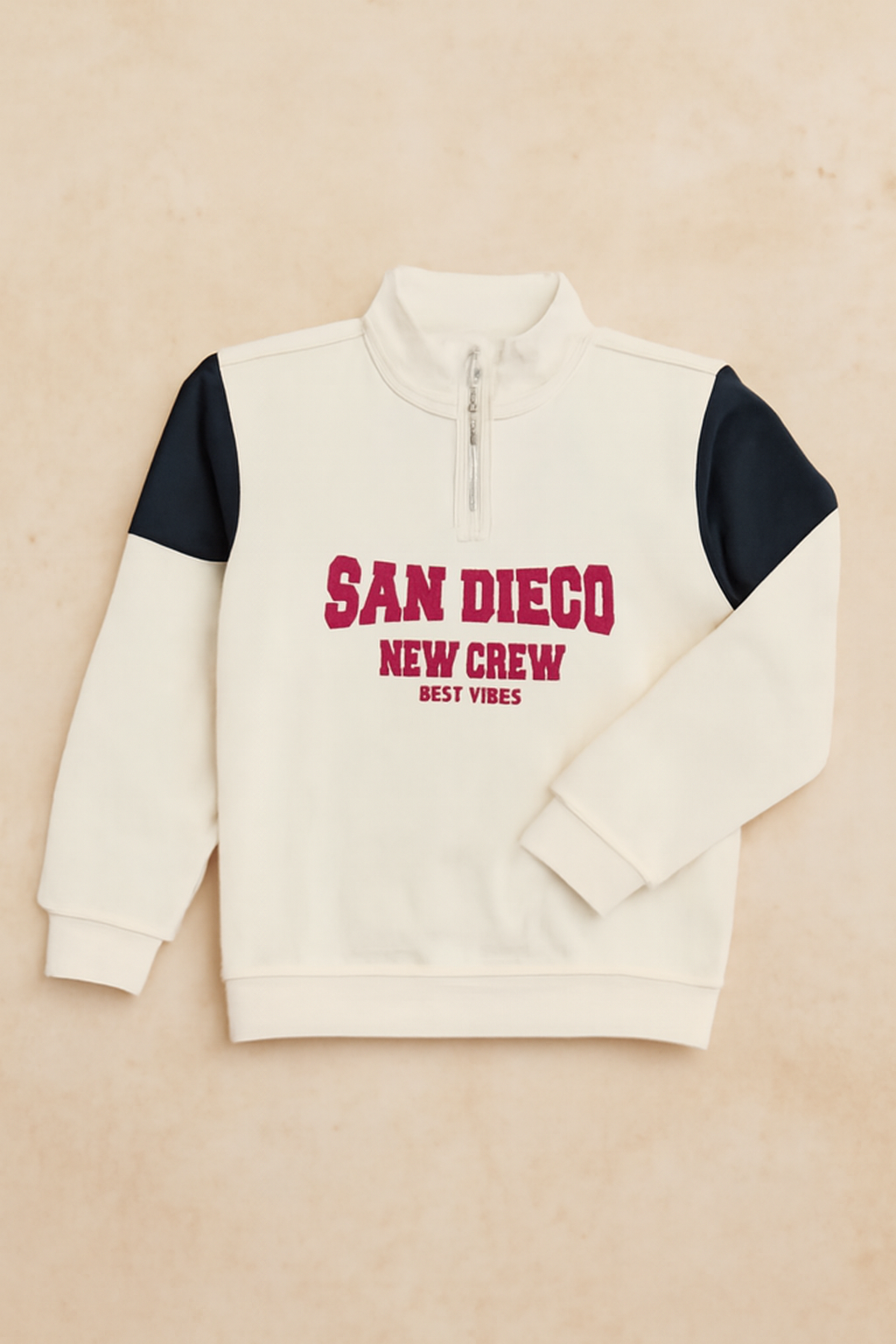 Sporty and Stylish Design: This zip-up sweatshirt features the bold "SAN DIEGO NEW CREW" print with "BEST VIBES" in contrasting red and navy colors, offering a cool, athletic look for kids.